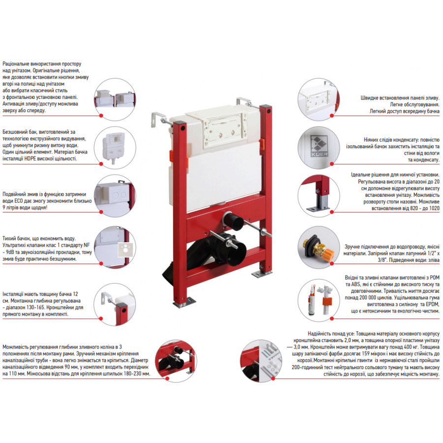 Інсталяція для підвісного унітазу Koer KT-0403 500x165x820mm без панелі змиву (KR5313) – ідеальний вибір для тих, хто цінує якість, стиль і надійність. Вона поєднує у собі сучасні технології, зручність монтажу та довготривалу експлуатацію. Обираючи Koer, ви отримуєте продукт, який відповідає всім вимогам сучасної сантехніки і забезпечує комфорт у вашій ванній кімнаті.