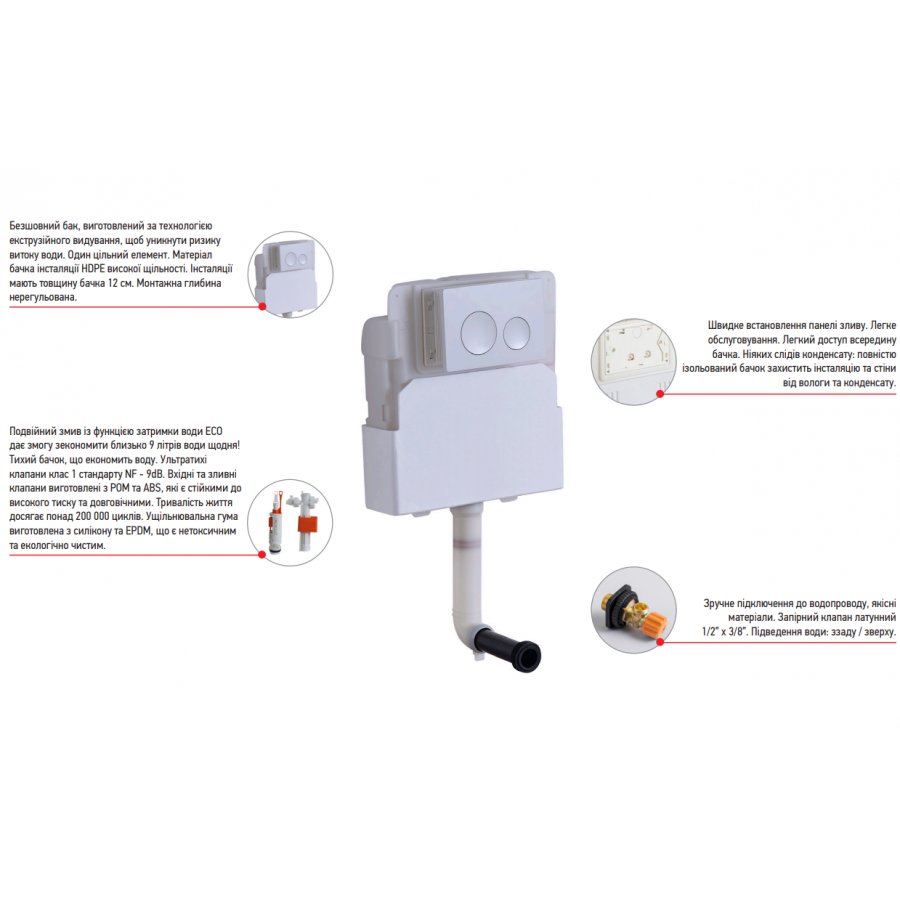 - Простота монтажу. Конструкція бачка передбачає легкий та швидкий монтаж, що значно економить час під час ремонту або встановлення сантехніки.