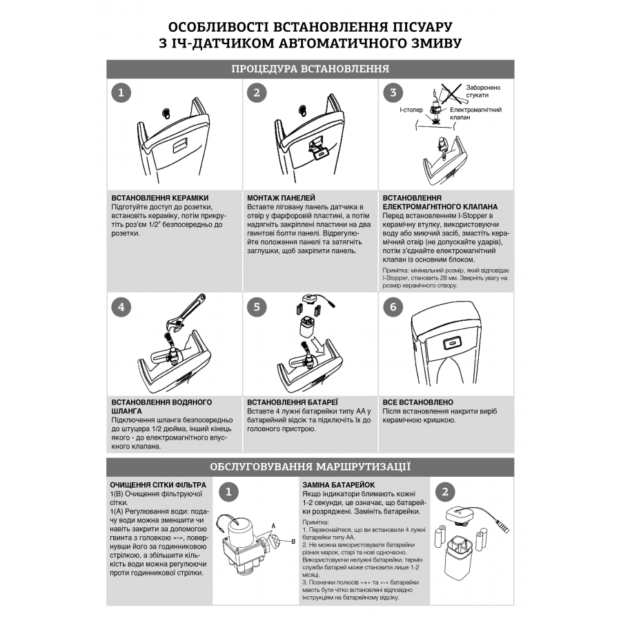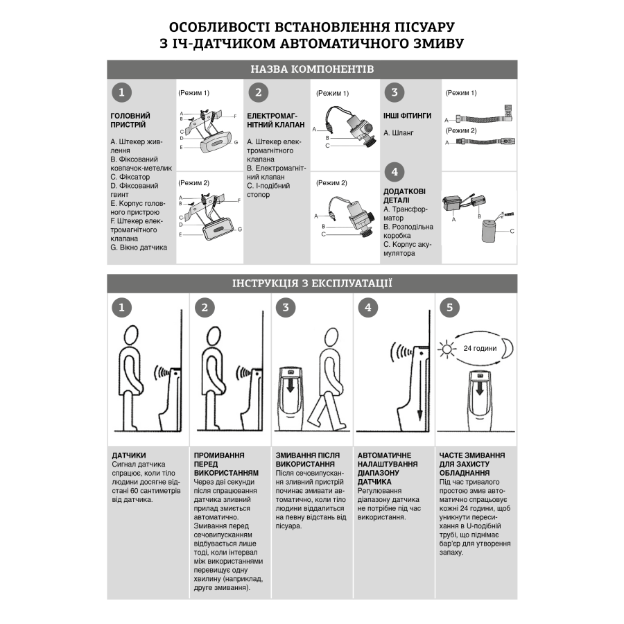 - Комплектація: система управління змивом пісуара з ІЧ датчиком, батарея, адаптер 220В