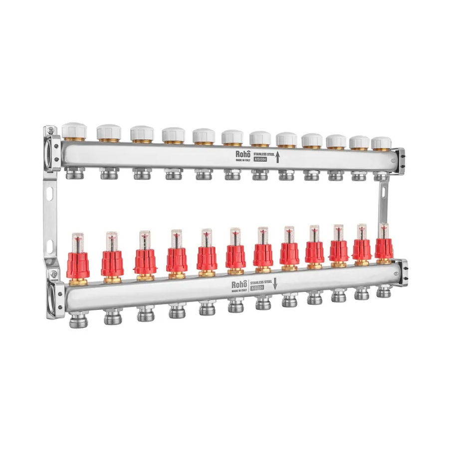 Колектор з витратоміром та термостатичними клапанами Roho R804-12M ідеально підходить для будинків із системою розгалужених теплих підлог або радіаторного опалення. Всі компоненти від ROHO проходять контроль якості, що гарантує високий рівень безпеки й зручності під час експлуатації. Монтаж виробу простий і зручний навіть для фахівців із базовим досвідом роботи з сантехнічними матеріалами.