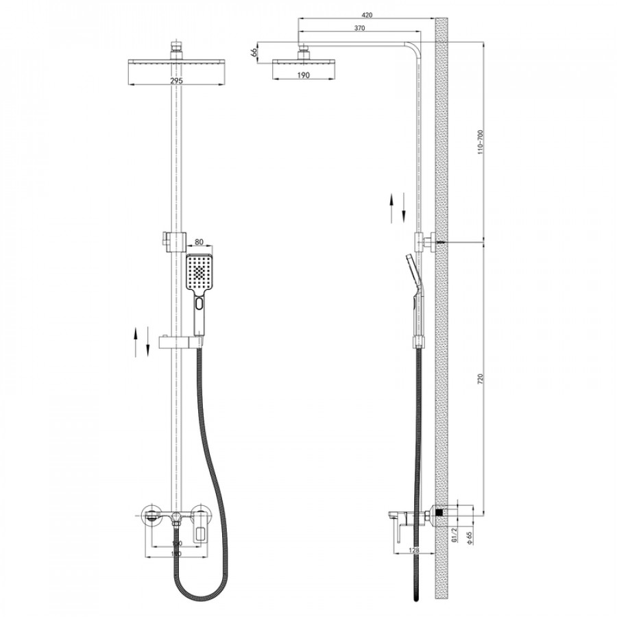 - Верхній душ: квадратний, розмір 250х250 мм.