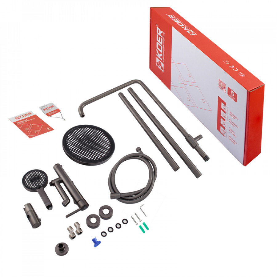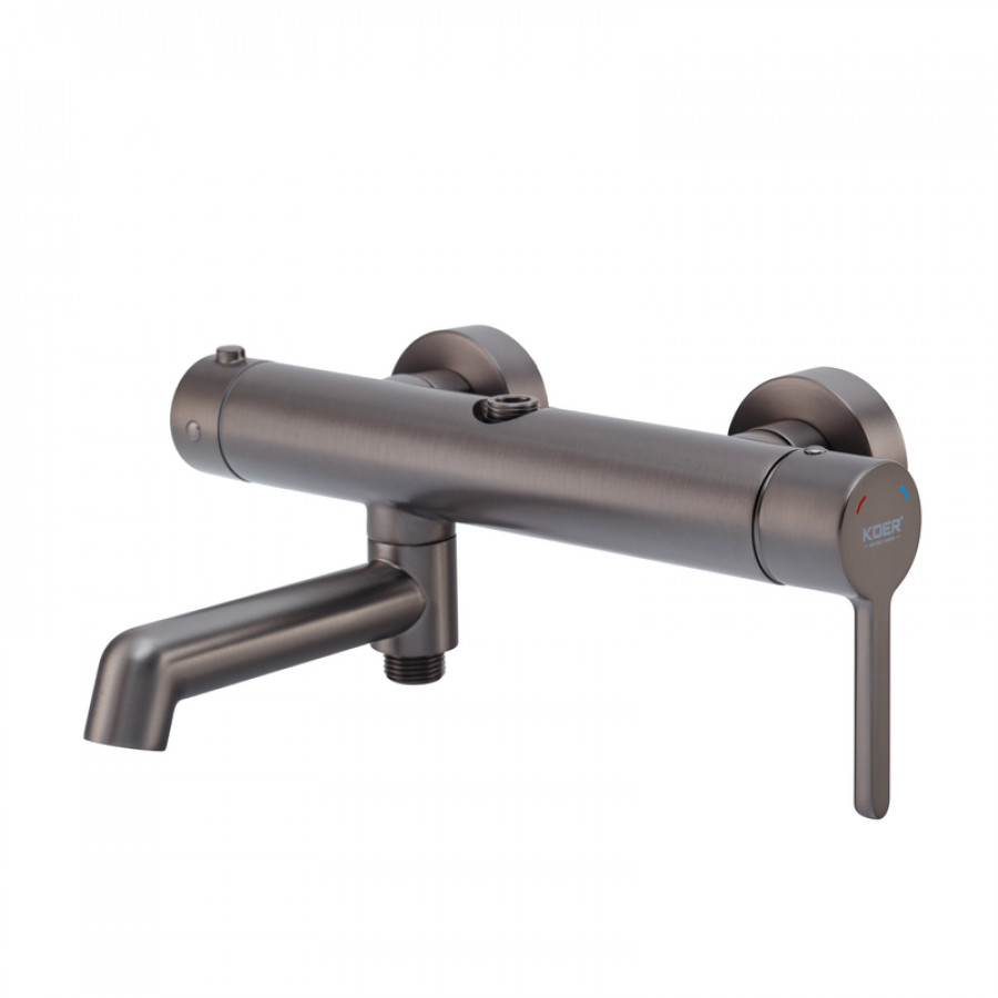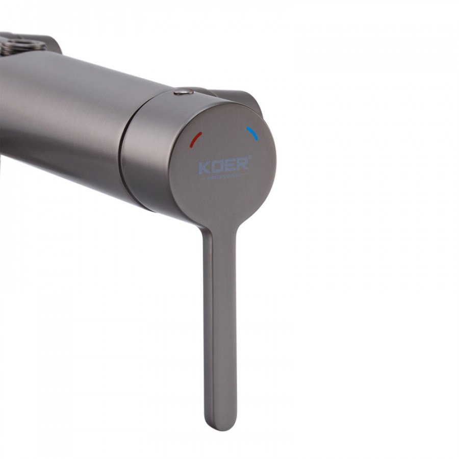 Змішувач Koer забезпечує точне налаштування температури та тиску води, що робить використання душової колони максимально зручним і безпечним. Графітове покриття поєднує елегантний вигляд із високою зносостійкістю, що особливо важливо в умовах підвищеної вологості ванної кімнати.