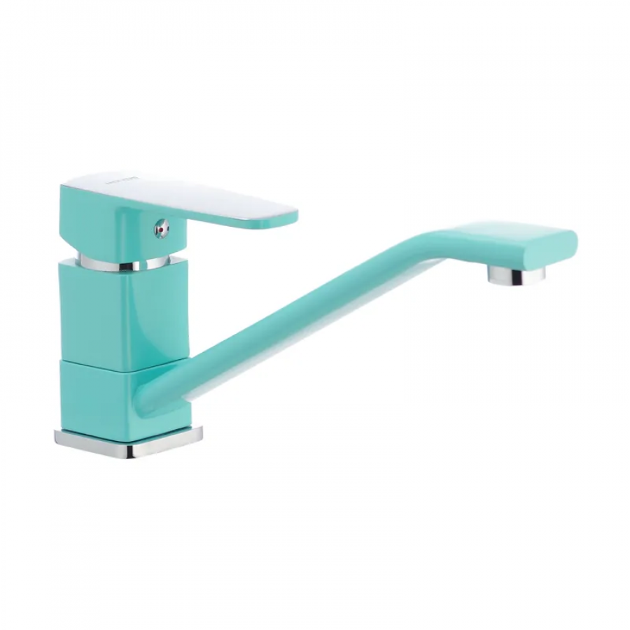 - Унікальний дизайн. Бірюзовий колір відрізняє цей змішувач від стандартних моделей, додаючи інтер'єру яскравих акцентів.