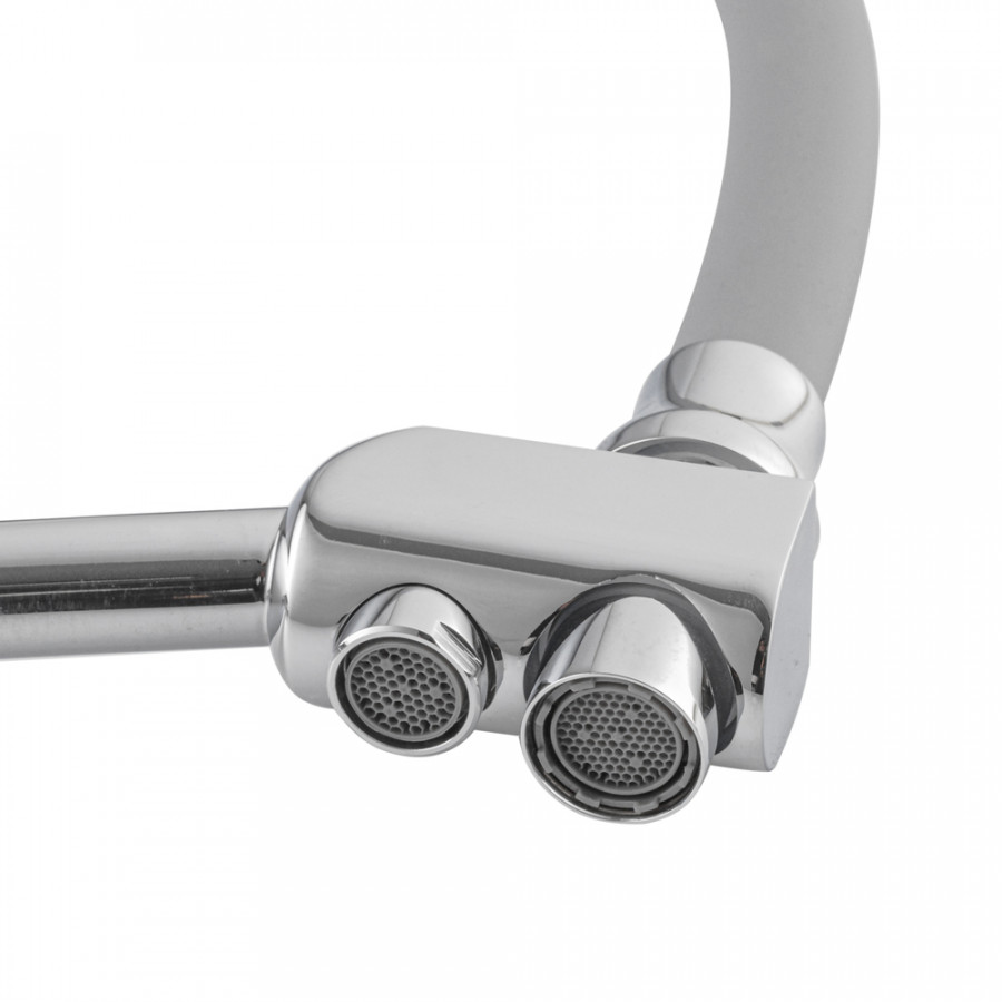 - Силіконовий вилив — гнучкий і довговічний, дозволяє легко направляти струмінь води в потрібну точку мийки.