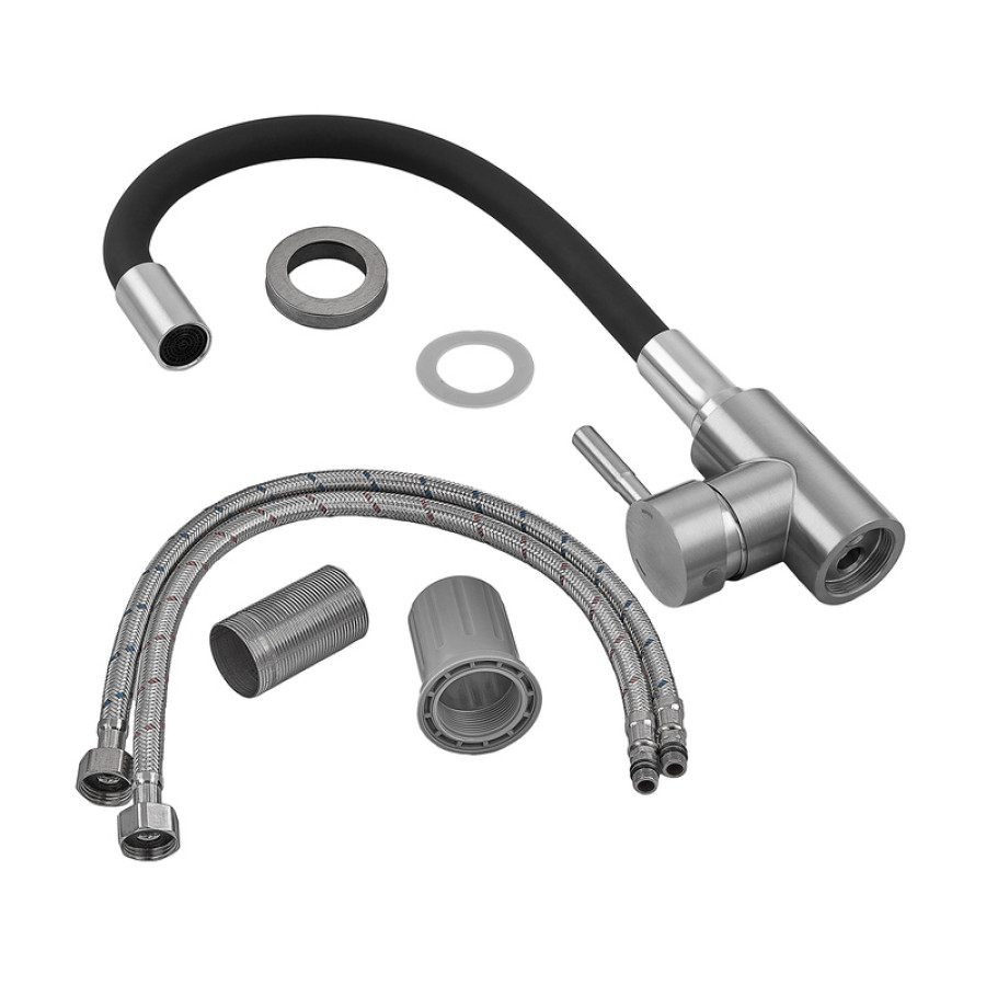 - Інноваційний силіконовий вилив. Гнучкий вилив із силікону чорного кольору дозволяє направляти струмінь води в будь-яку точку мийки без зайвих зусиль.