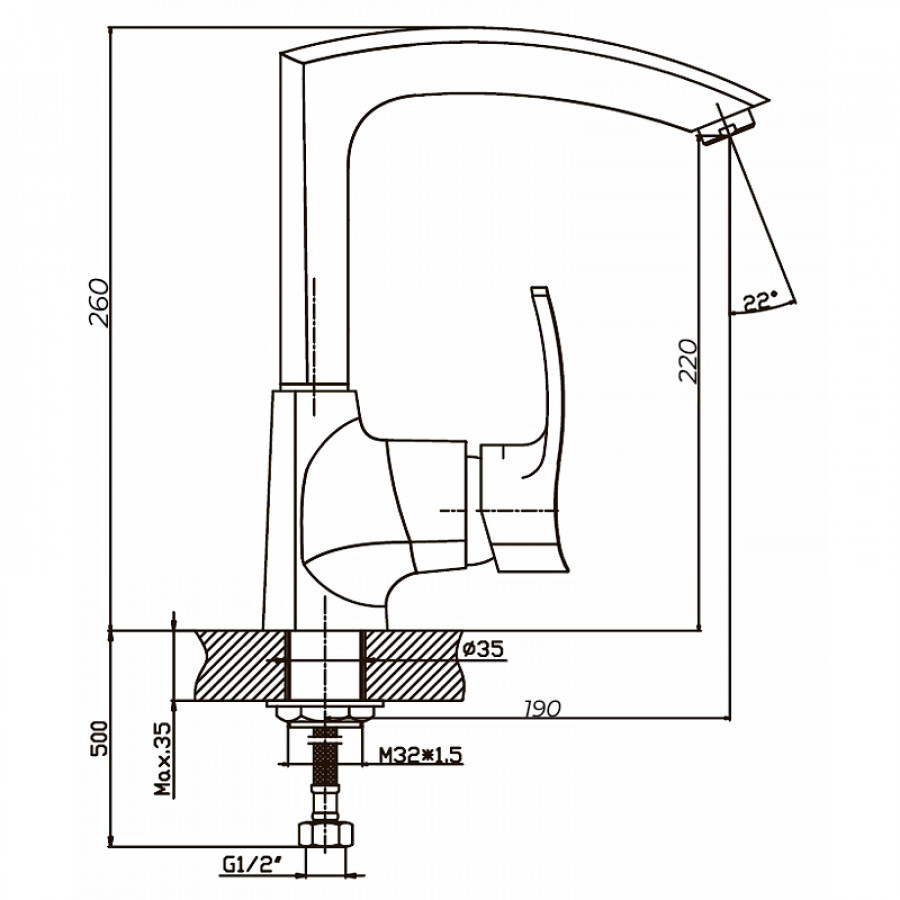 - Довжина виливу: 190 мм;