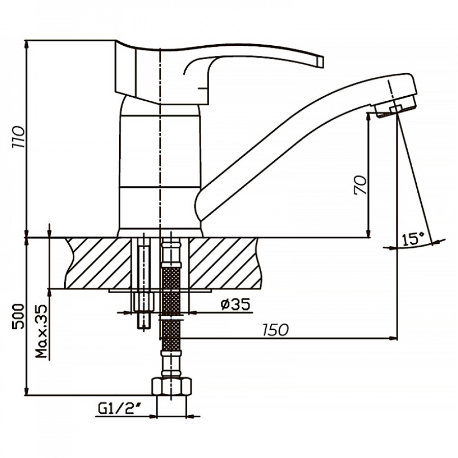 - Довжина виливу 15 см – оптимальна для більшості умивальників, забезпечує зручне наповнення посуду та миття рук.