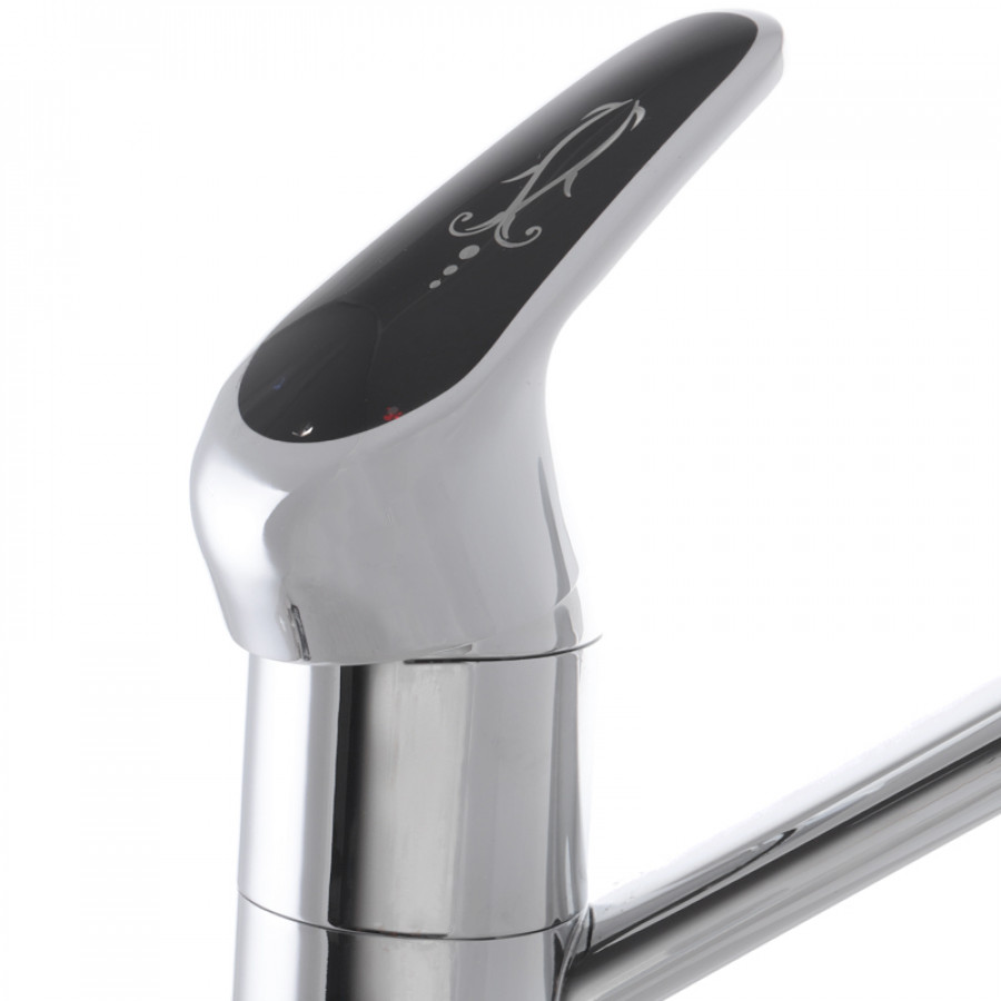 - Ергономічний дизайн: зручно розташована чорною ручкою для комфортного регулювання температури та напору води;
