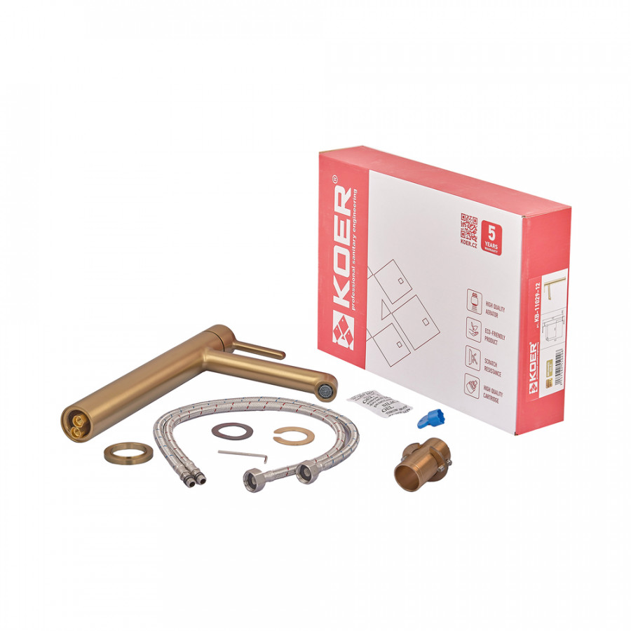Змішувач Koer KB-11029-12 — це ідеальне рішення для тих, хто цінує якість, стиль і функціональність у сантехніці. Високий змішувач для умивальника допоможе не лише забезпечити комфортний доступ до води, а й стане яскравим акцентом у вашій ванній кімнаті або кухні. Колір матове золото (KR5502) додає виробу особливого шарму, поєднуючи сучасний дизайн із розкішним виглядом.