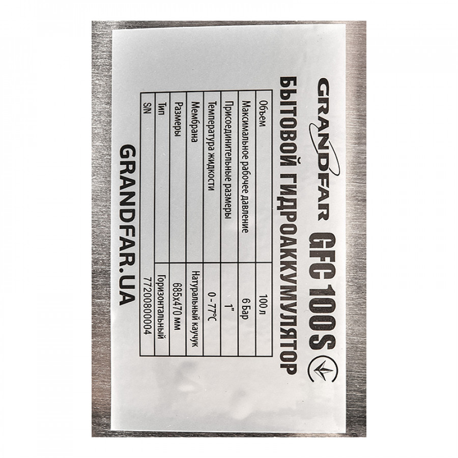 Гідроакумулятор для насосних станцій Grandfar GFC100S горизонт. 100л (корпус-нерж.сталь) (GF1394) – надійність і довговічність у вашій системі водопостачання