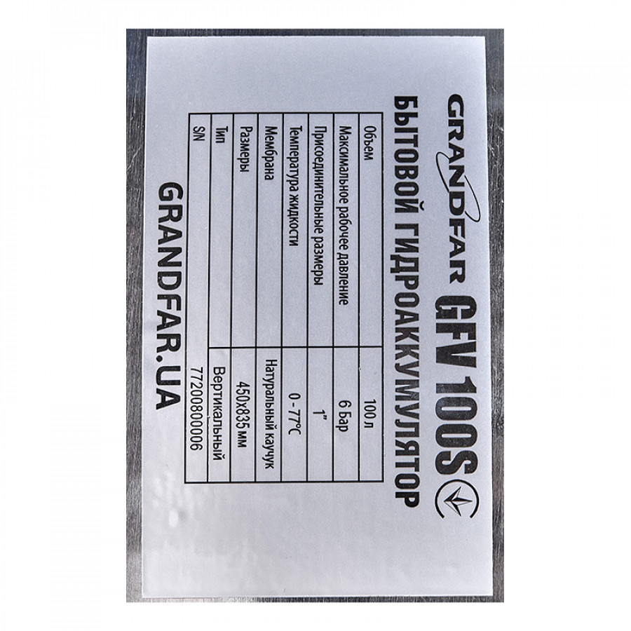 Гідроакумулятор для насосних станцій Grandfar GFV100S вертикал. 100л (корпус-нерж.сталь) (GF1397)
