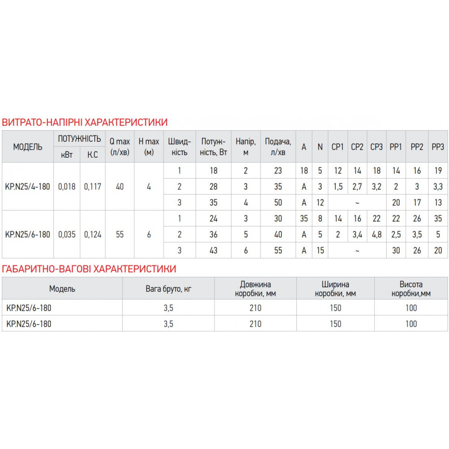 Основні характеристики насоса Koer KP.N25 / 6-180