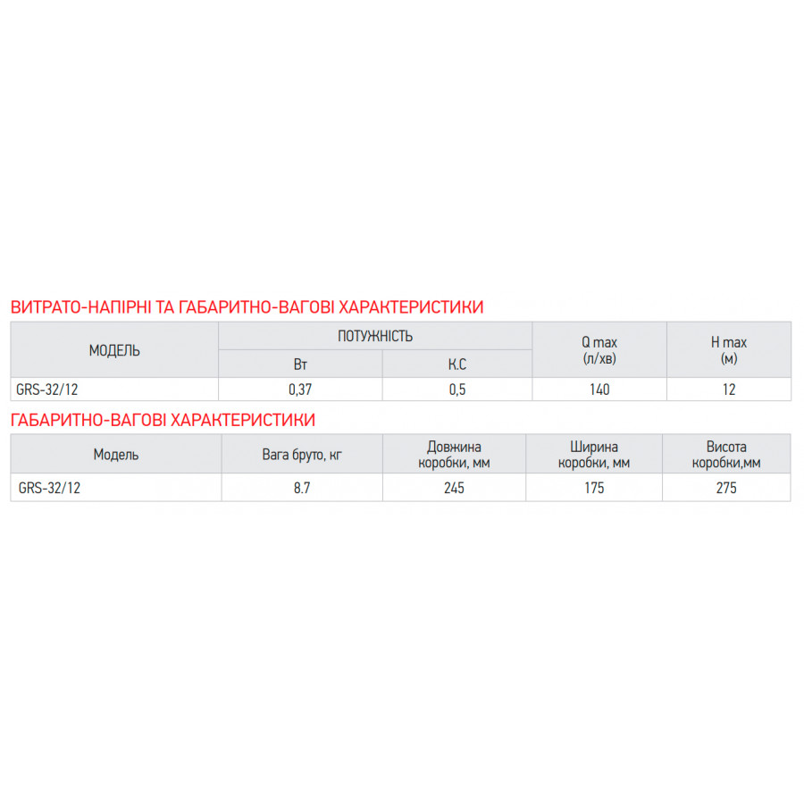 Технічні характеристики насоса KOER GRS 32/12 (KP2772)