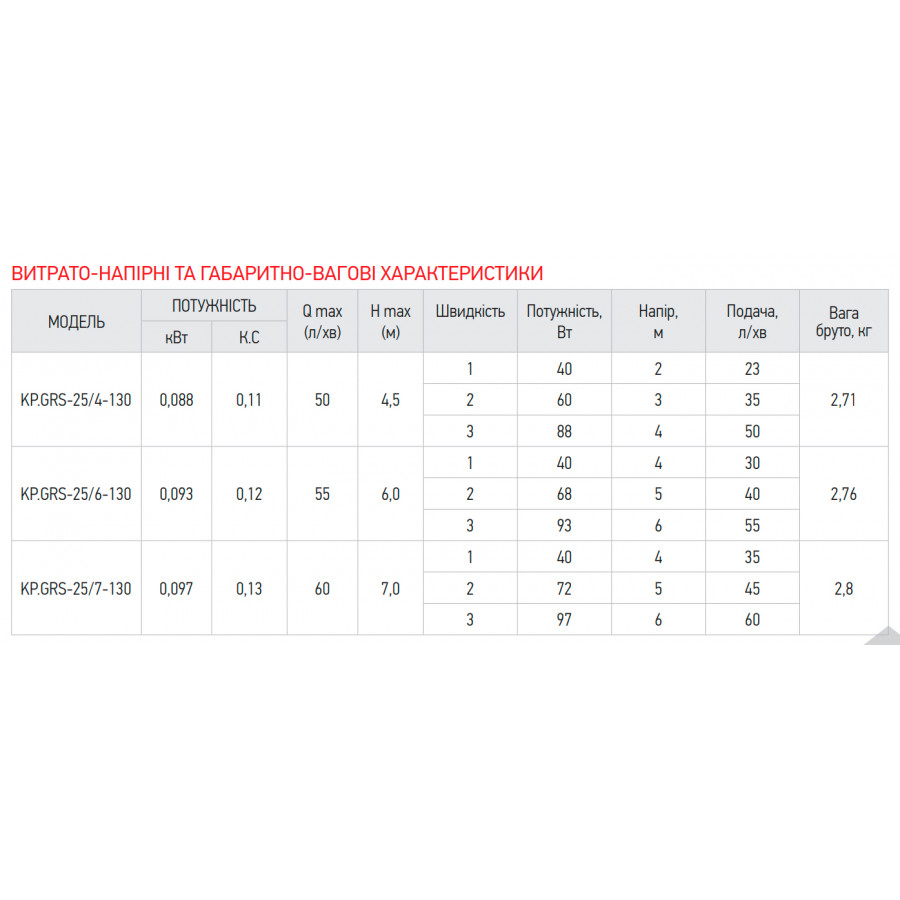 Основні характеристики насоса Koer KP.GRS-25/7-130