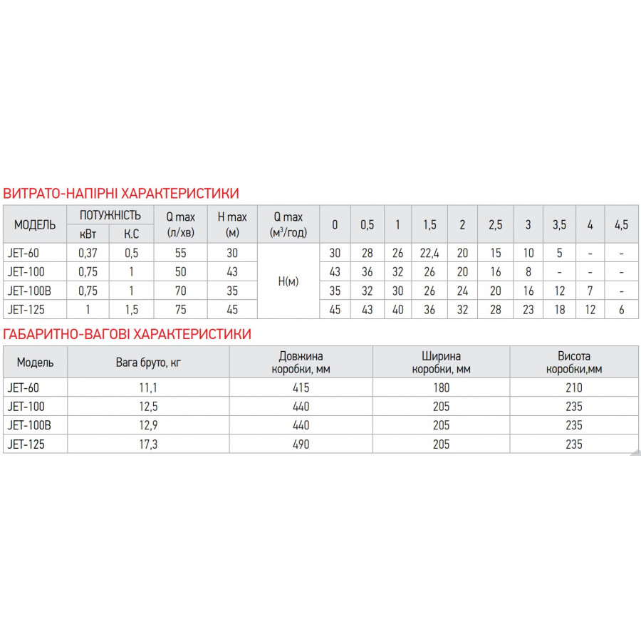 - Максимальна глибина всмоктування: 8 метрів