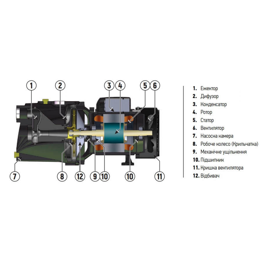 - Тип насоса: самовсмоктувальний відцентровий з вбудованим гідроакумулятором (пятерником).