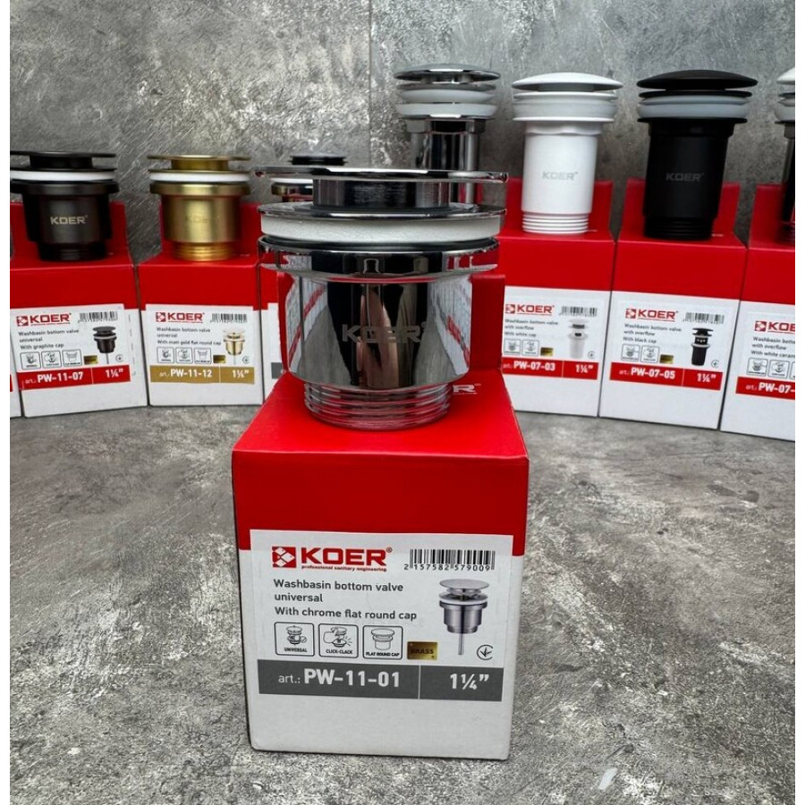 Донний клапан для раковини Koer PW-11-01 1 1/4'' універсальний (з/без перел) СLICK-СLACK (Колір хр