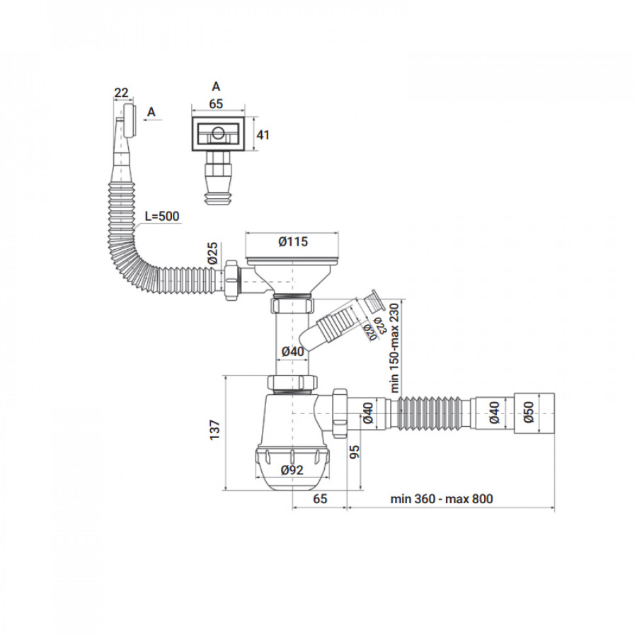 Сифон Zerix SK-02-B має стандартний розмір випуску 3 1/2"x40 мм, що відповідає більшості кухонних мийок та каналізаційних систем в Україні. Конструкція включає: