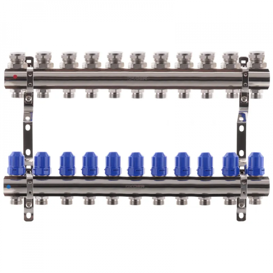 Завдяки наявності 11 виходів, цей колектор дозволяє підключити різні контури опалення, наприклад, тепла підлога, радіатори або конвектори, забезпечуючи індивідуальний контроль за кожним контуром.