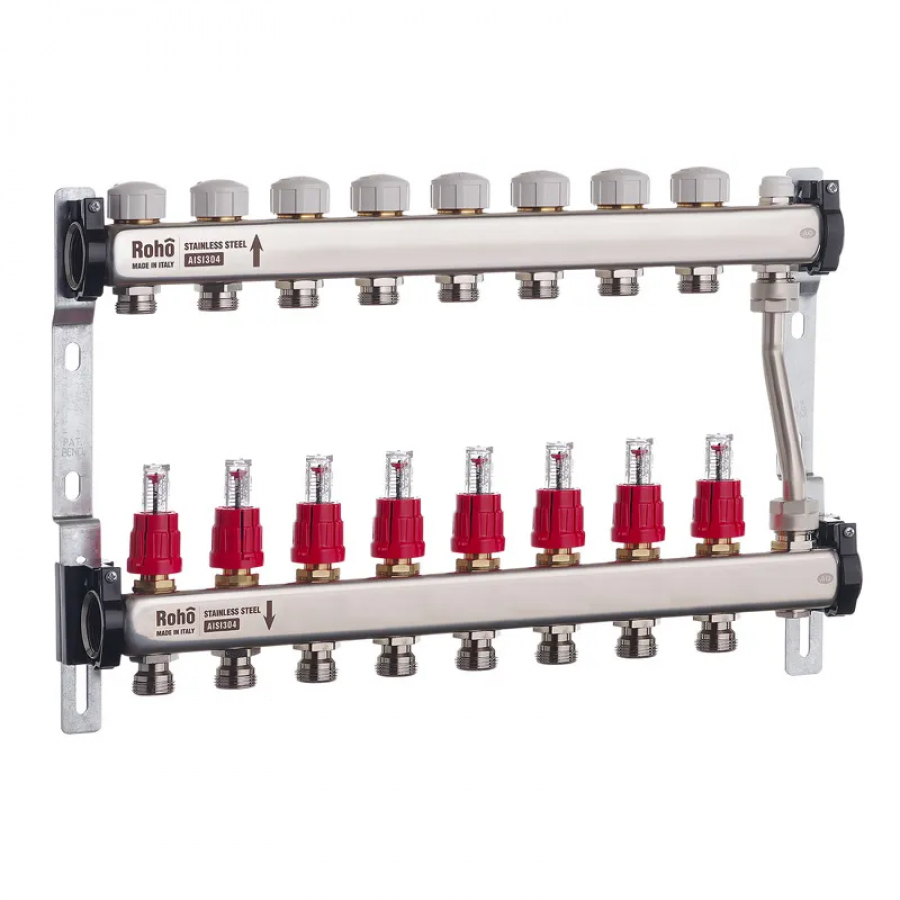 Колектор з витратомірами та термостатичними клапанами Roho R814-08 - 1"х 8 виходів – це надійний та ефективний компонент, який дозволяє забезпечити комфортне опалення у вашому будинку чи офісі. Завдяки високій якості матеріалів, точному регулюванню та простоті монтажу, цей колектор стане відмінним вибором для професійних монтажників та приватних користувачів.