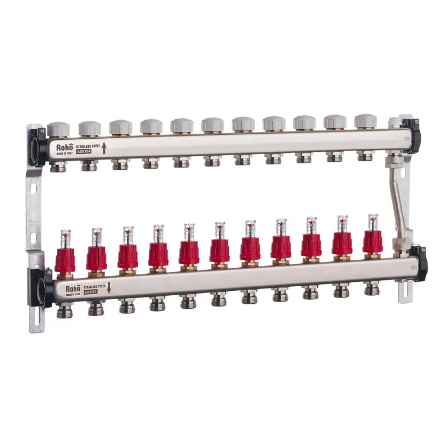 Колектор з витратомірами та термостатичними клапанами з байпасом Roho R814-11 – Надійне рішення для систем теплої підлоги