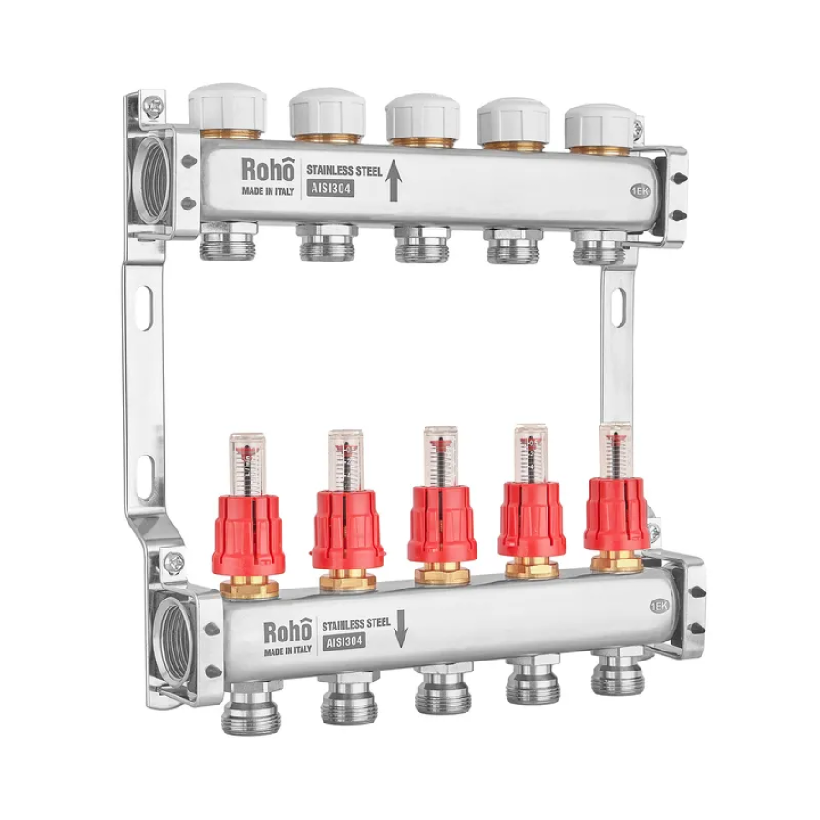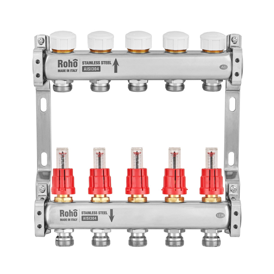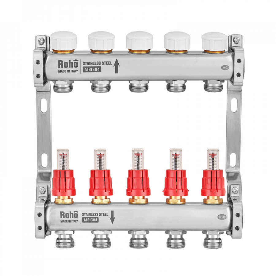Колектор Roho R804-05M розроблений спеціально для розподілу потоку теплоносія у системах водяної теплої підлоги. Завдяки наявності витратомірів ви легко зможете налаштувати і контролювати витрати води в кожному контурі, що дозволяє досягти максимальної енергоефективності та рівномірного обігріву підлоги на всіх ділянках.