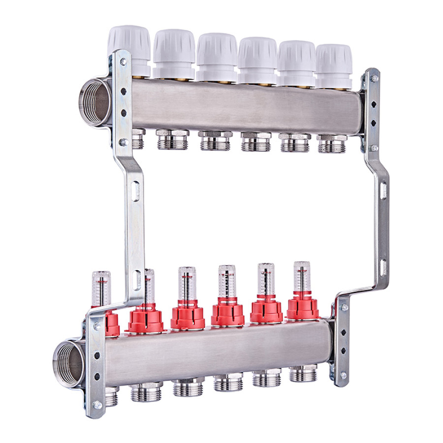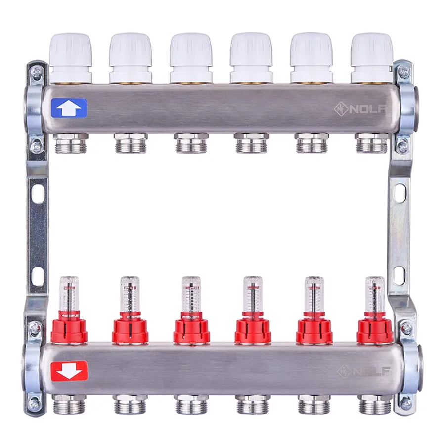 Колекторний блок з витратомірами Nolf NF.2100-06S 1"x6 (корпус нержавіюча сталь) (NF3020) – надійне рішення для водяної теплої підлоги