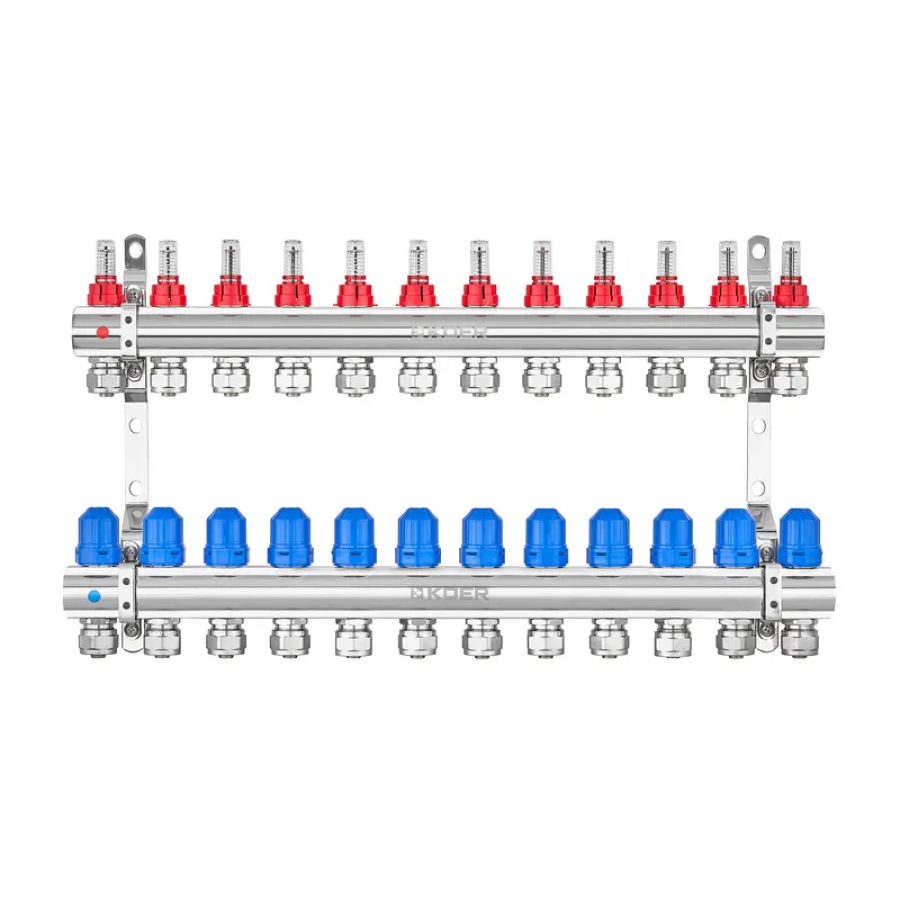 Колекторний блок Koer ідеально підходить для розподілу водяного теплоносія між окремими контурами теплої підлоги, що дозволяє точно регулювати температуру в кожній кімнаті. Це забезпечує підвищений комфорт і економію енергоресурсів завдяки рівномірному прогріву простору.