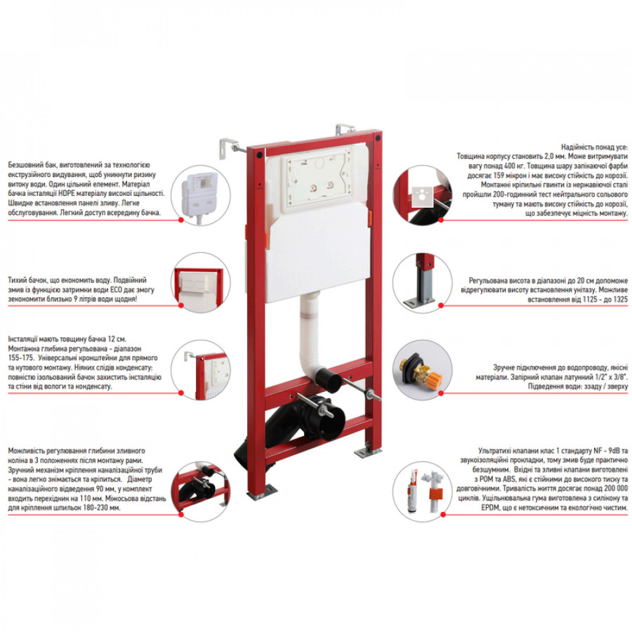 - Комплектація: унітаз, інсталяційний модуль, кнопка змиву, кріплення