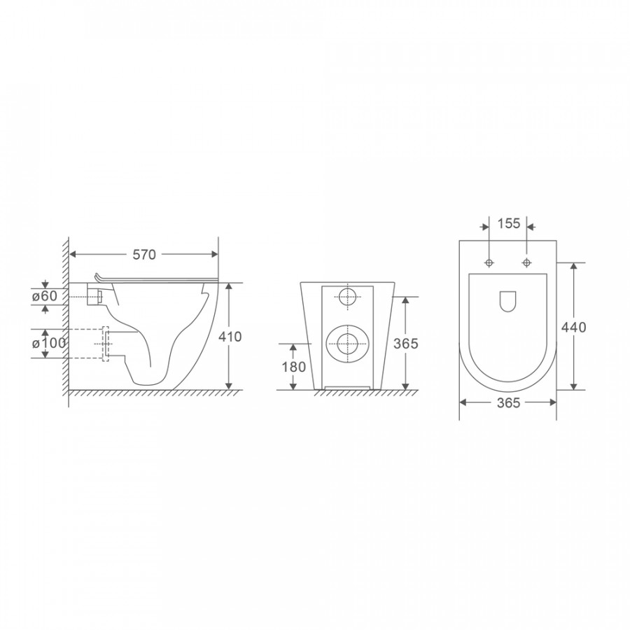 - Безбачкова конструкція — сучасний дизайн з відкритою системою змиву, який полегшує монтаж і обслуговування.